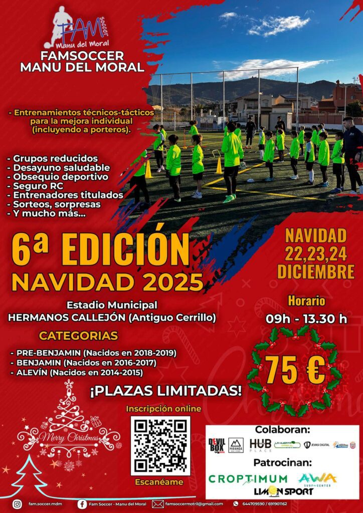 El clinic de tecnificación FAMSOCCER Manu del Moral presenta su edición navideña, un programa intensivo de perfeccionamiento dirigido a jóvenes futbolistas que se celebrará los días 22, 23 y 24 de diciembre en el Estadio Municipal Hermanos Callejón (antiguo Cerrillo). El clinic, abierto a jóvenes de las categorías prebenjamín (nacidos 2018-2019), benjamín (2016-2017) y alevín […]