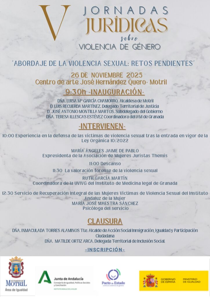 V Jornadas Jurídicas sobre Violencia de Género ‘Aborde en la violencia sexual: retos pendientes’. Miércoles, 26 de noviembre de 2025 a las 09:30 horas en el Centro de Arte José Hernández Quero. Este año, el evento tratará sobre la experiencia en la defensa de las víctimas de violencia sexual tras la entrada en vigor […]