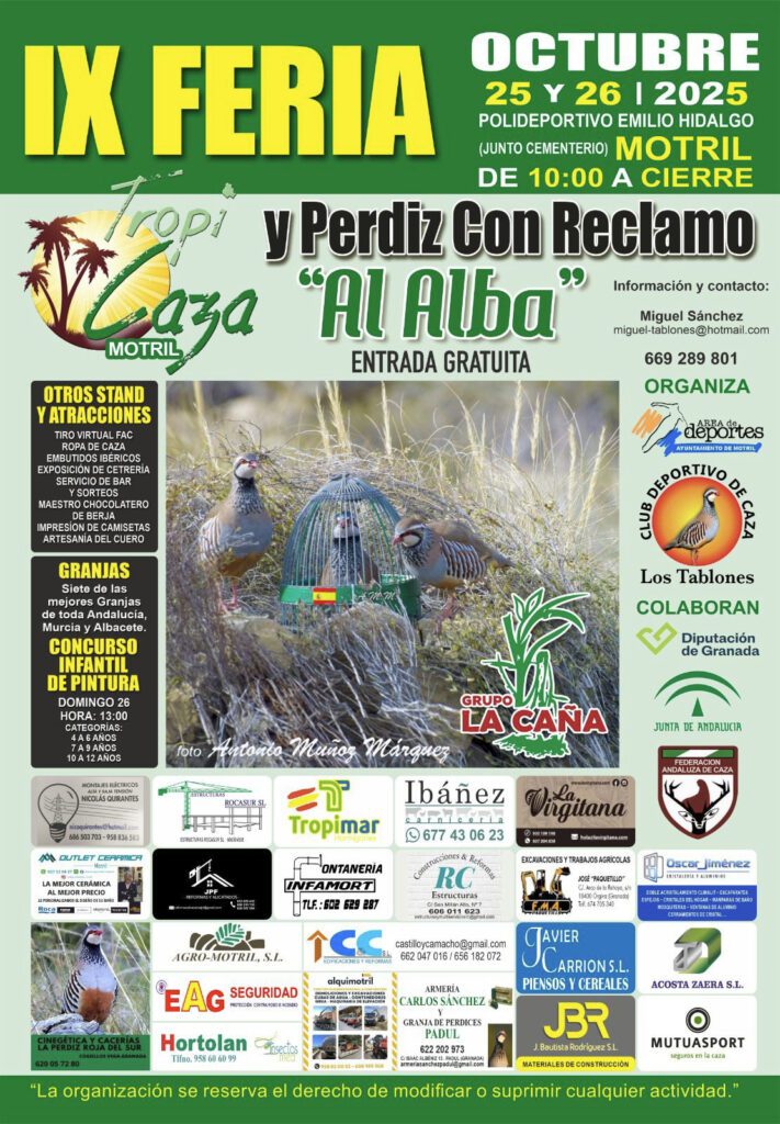 Motril vivirá la IX Feria TropiCaza y Perdiz con Reclamo “Al Alba”, los día 25 y 26 de octubre en el Pabellón 2 del Polideportivo Emilio Hidalgo, junto al cementerio. La feria contará con 16 stands y siete de las mejores granjas de toda Andalucía, Murcia y Albacete, además de múltiples propuestas para todos los […]
