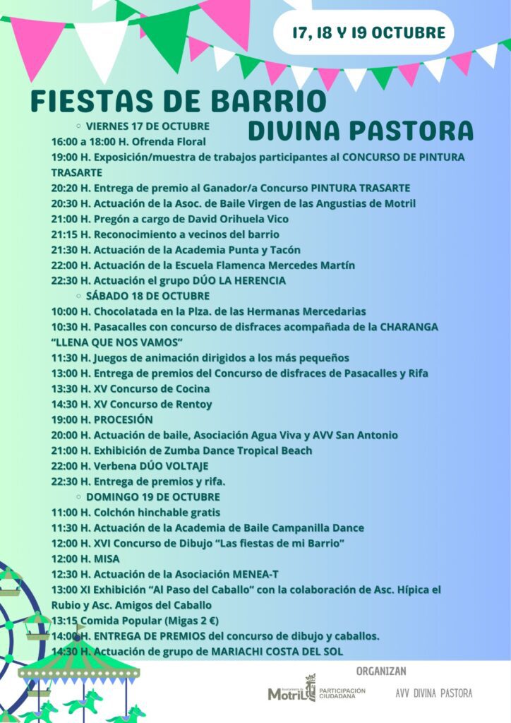 Programación para las fiestas del barrio motrileño de Capuchinos en honor a la Divina Pastora. Estos festejos se celebrarán desde el viernes 17 al domingo 19 de octubre de 2025 en la Plaza de las Mercedarias de Motril.