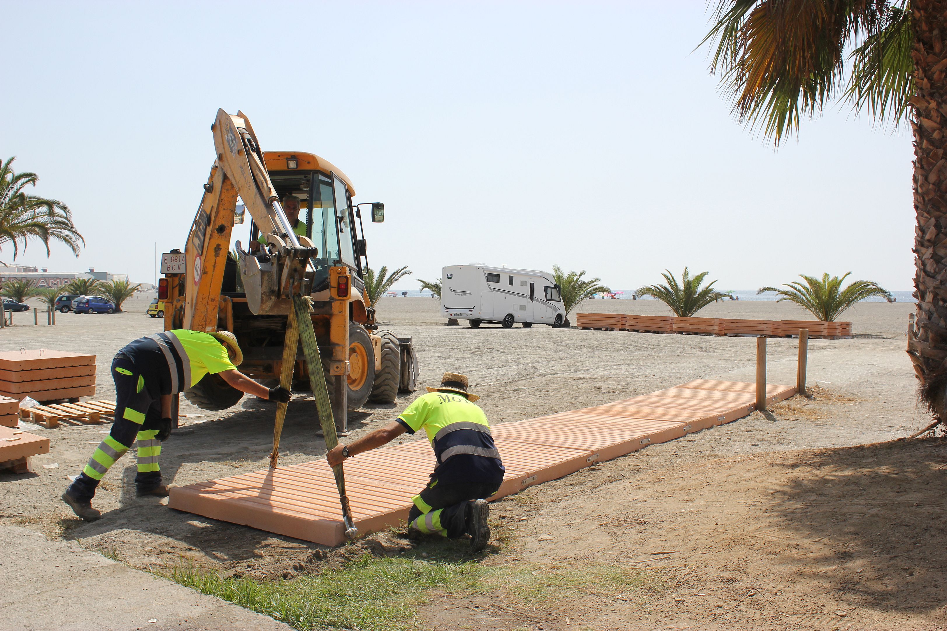 Motril trabaja para que sus playas tengan mejores equipamientos. Así, el Ayuntamiento ha procedido esta semana a la instalación de cerca de 150 metros lineales de pasarelas de hormigón en el acceso de la Playa del Cable, junto a las Tres R. Operarios de la concejalía de Agricultura están montando unas 150 unidades de placas de hormigón de un metro de largo por uno y medio de ancho cuyo color imita a la madera y que viene a optimizar de forma sensible el paso de los usuarios a la playa en esta zona del barrio de Santa Adela. A este equipamiento se añadirá un módulo de ducha con dos salidas de agua y otros dos más en la parte más baja para limpiar de arena los pies. En total, se han invertido 23.385,43 euros.