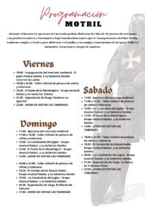 El Mercado Medieval llega a Motril los días 17, 18 y 19 de abril, más concretamente entre la Plaza de los Agustinos y la Plaza de la Tenería. Durante todo el fin de semana, este evento trasladará a los motrileños a la época medieval a través de más de 40 puestos de artesanía con joyas hechas a mano, cuero, jabones naturales y tesoros únicos traídos de lejanas tierras; además de la instalación de tabernas y la gastronomía más especial de la época. Todo el evento estará acompañado por músicos itinerantes que, a través del ritmo de las gaitas y tambores, recorrerán cada rincón, junto con un espectáculo de fuego y la bailarina medieval. Todo preparado para que el Mercado Medieval invada cada rincón de la ciudad.